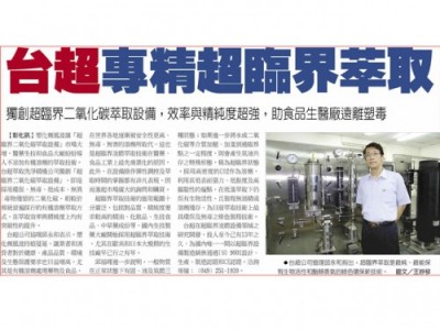 | [2011/07/04] | [工商時報/自動化工業周刊3版廠商巡禮篇/專3版] | 台超專精超臨界萃取 獨創超臨界二氧化碳萃取設備 效率與精純度超強,助食品生醫廠遠離塑毒 | 【彰化訊】